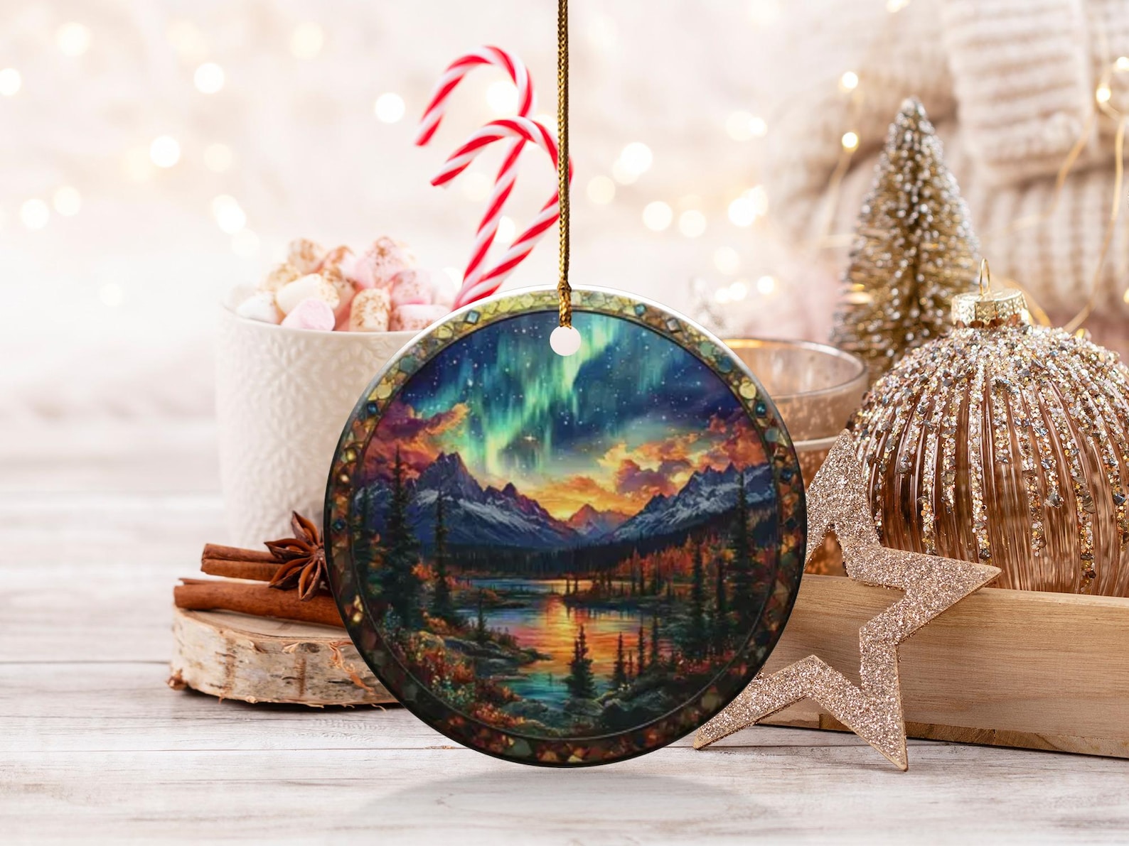 Northern Lights Ornament, Aurora Borealis, Mountain Lake Art, Nature Inspired Ornament, Stained Glass Style, Landscape Scene Ornament