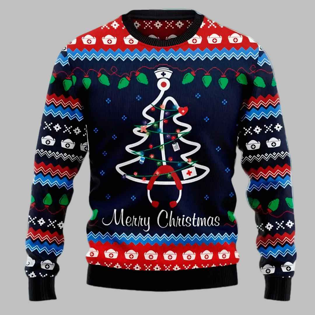 This eye-catching sweater features a Christmas tree creatively designed with a stethoscope, adorned with colorful lights and medical symbols like a nurse’s hat and a first aid kit. The vibrant red and blue color scheme adds a festive touch, while the classic ugly Christmas sweater pattern provides a fun and quirky appeal. Made from quality materials, this sweater is not only comfortable to wear but also built to last, ensuring you can enjoy its festive charm for many Christmases to come.
