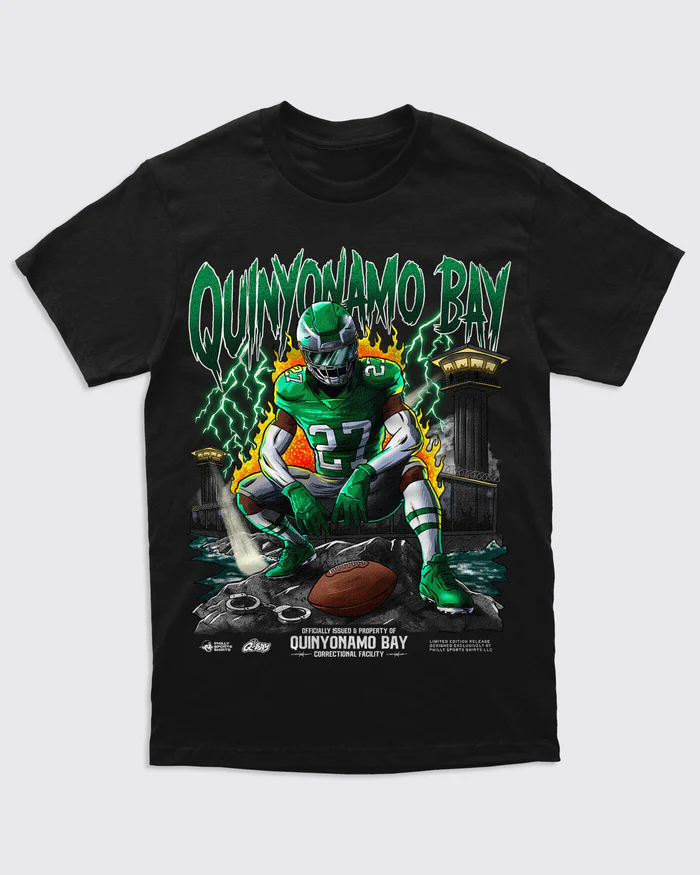 Featuring striking “Quinyonamo Bay” graphics with the official Philadelphia Eagles colors and logo accents, this shirt captures the grit and energy of Philly football.