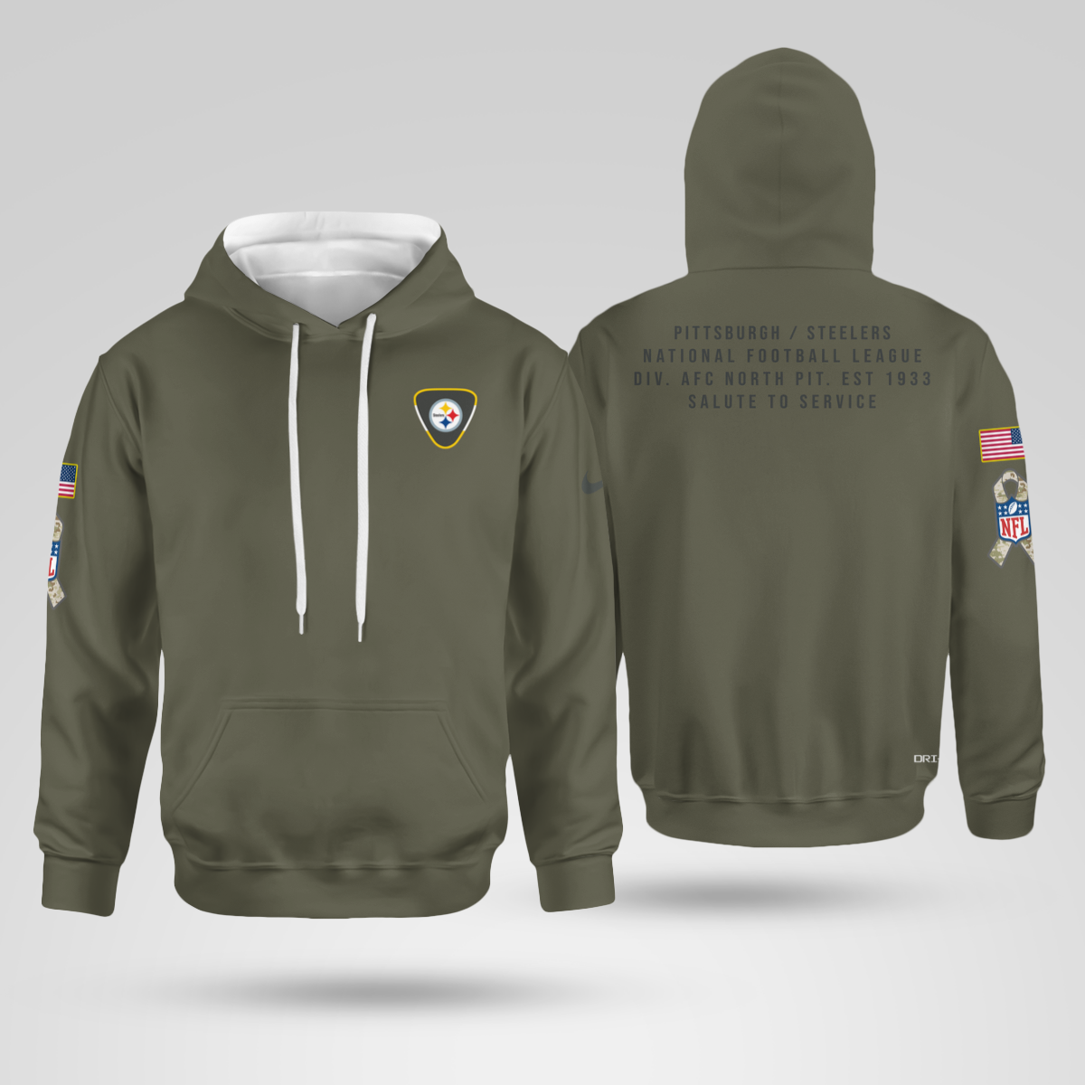 Whether you’re tailgating at Heinz Field, attending military appreciation events, or enjoying a casual outing, this hoodie is perfect for any occasion. The olive color provides a unique, military-inspired touch that lets you honor both the military and your Steelers pride.