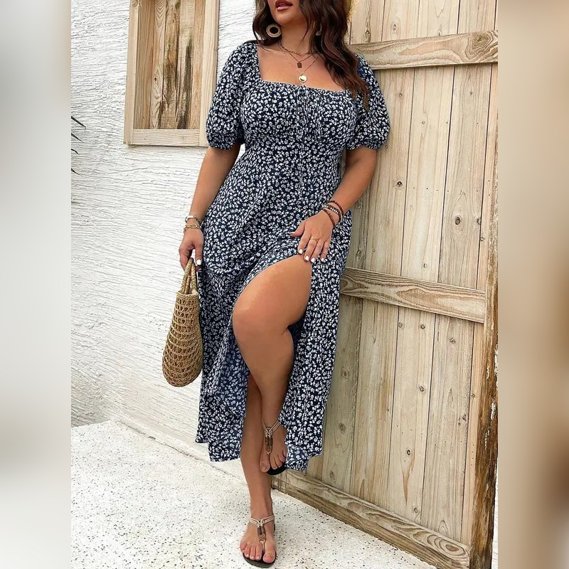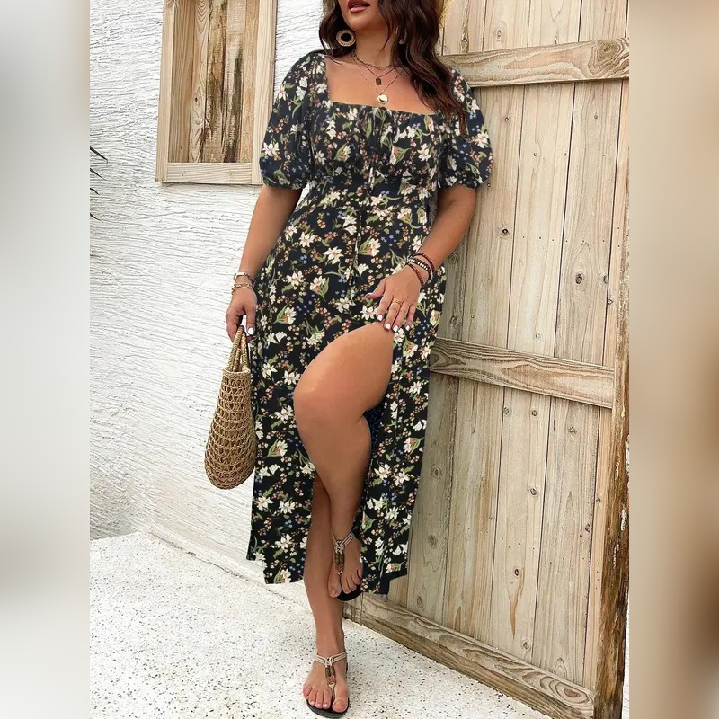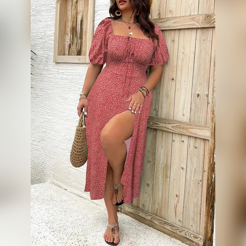 Plus Size Boho Split Thigh Dress with Puff Sleeves – Floral Tie-Front Summer Dress for Women