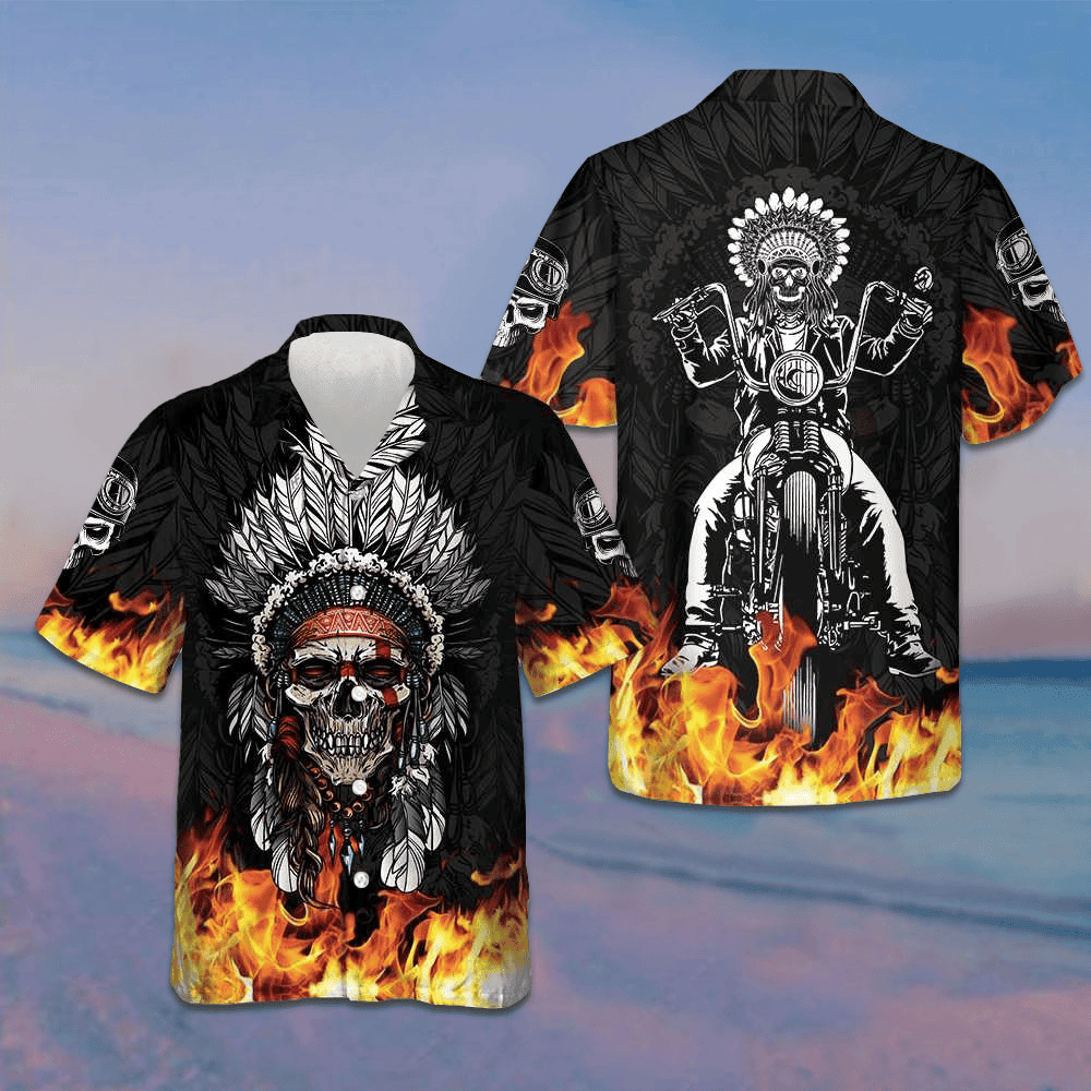 Racing Indian Skull Fire Hawaiian Shirt Flame Skull Biker Shirt Gifts For Him