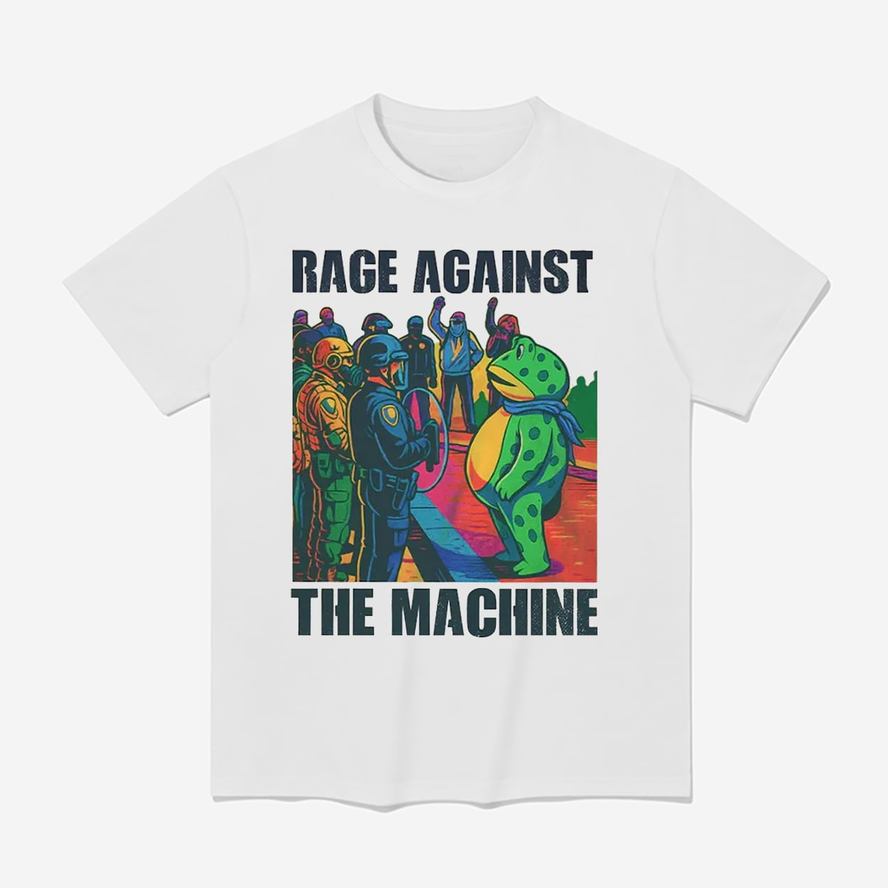 Because rage never looked this good. Featuring a striking frog graphic styled in the spirit of Rage Against The Machine’s revolutionary aesthetic, this shirt captures the blend of defiance, irony, and underground culture that fans live for.