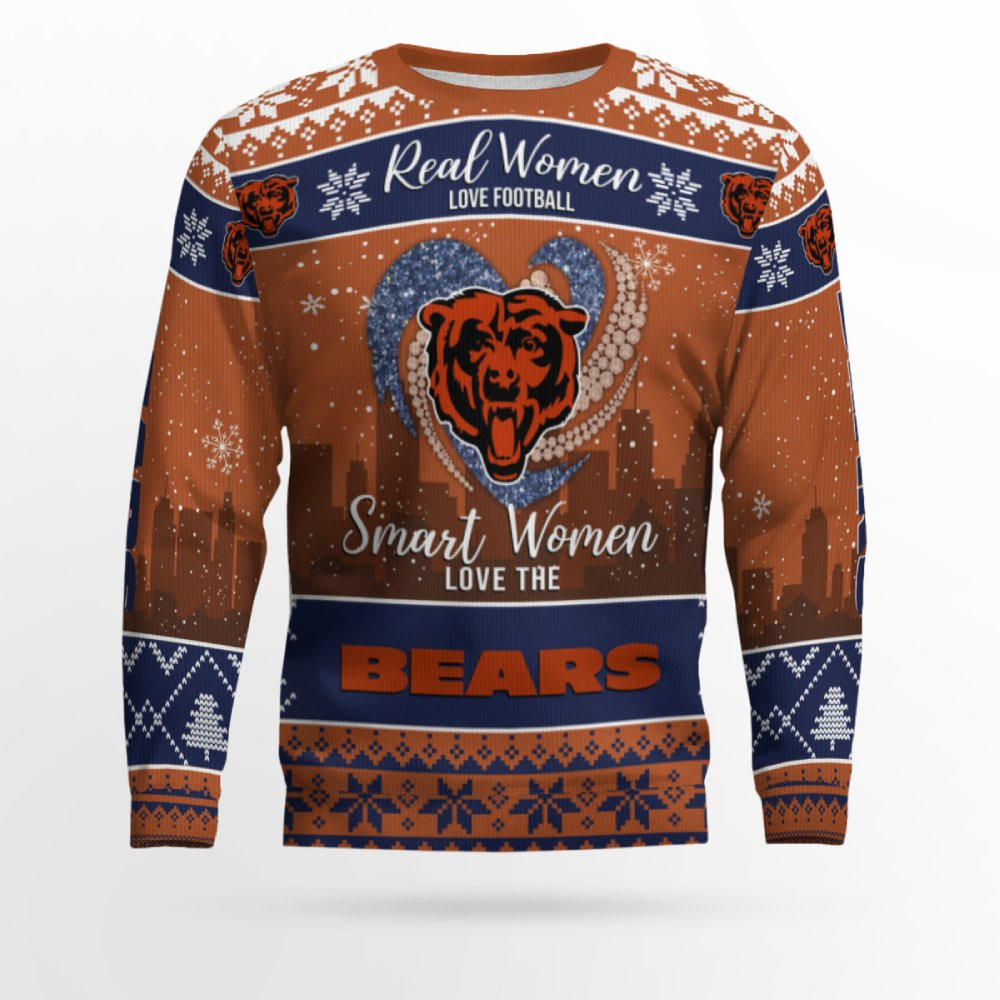 The Real Women Love Football Smart Women Love Chicago Bears Ugly Sweater is more than festive wear—it’s a proud statement of fandom and wit, built for both the holidays and game day excitement. 🐻🏈✨