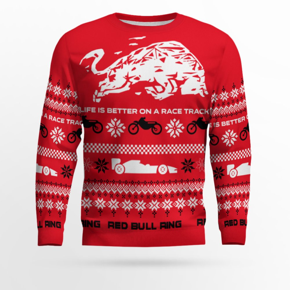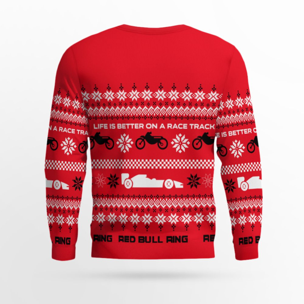 The sweater features the Red Bull Ring logo with festive holiday accents, blending the excitement of motorsport with the cozy vibes of Christmas. Whether you’re celebrating the winter season with friends or gearing up for race season, this design combines your love for speed and the holiday spirit.