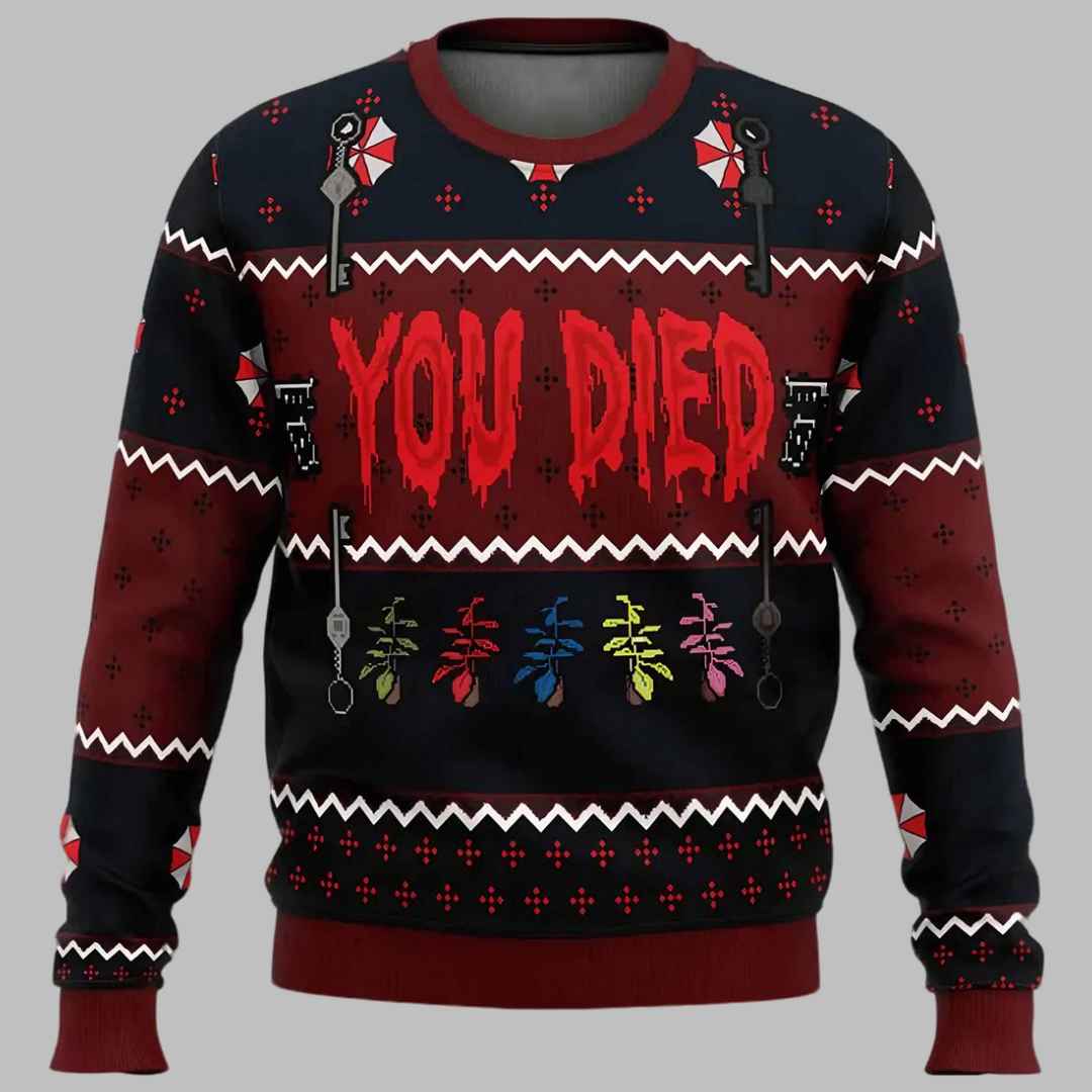 This unique knitted sweater features the infamous “You Died” screen message, a chilling reminder of countless encounters with zombies and bio-organic weapons. The ominous red lettering is splashed across a dark background, adorned with festive patterns inspired by the game’s iconic imagery, including the Umbrella Corporation logo, herbs, keys, and ink ribbons.