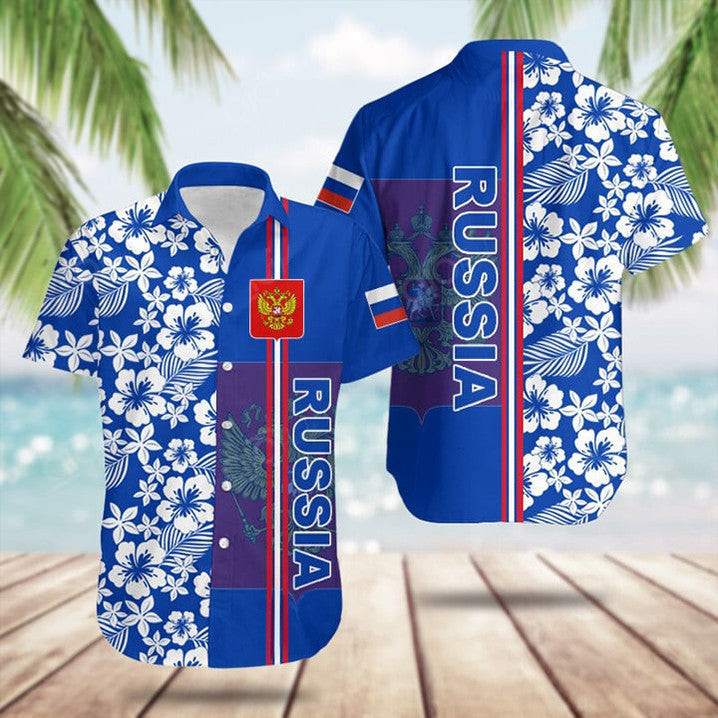 Russia Coat Of Arms Hibiscus Pattern Hawaiian Shirt Summer Button Up Gifts For Russian -WearandDecor