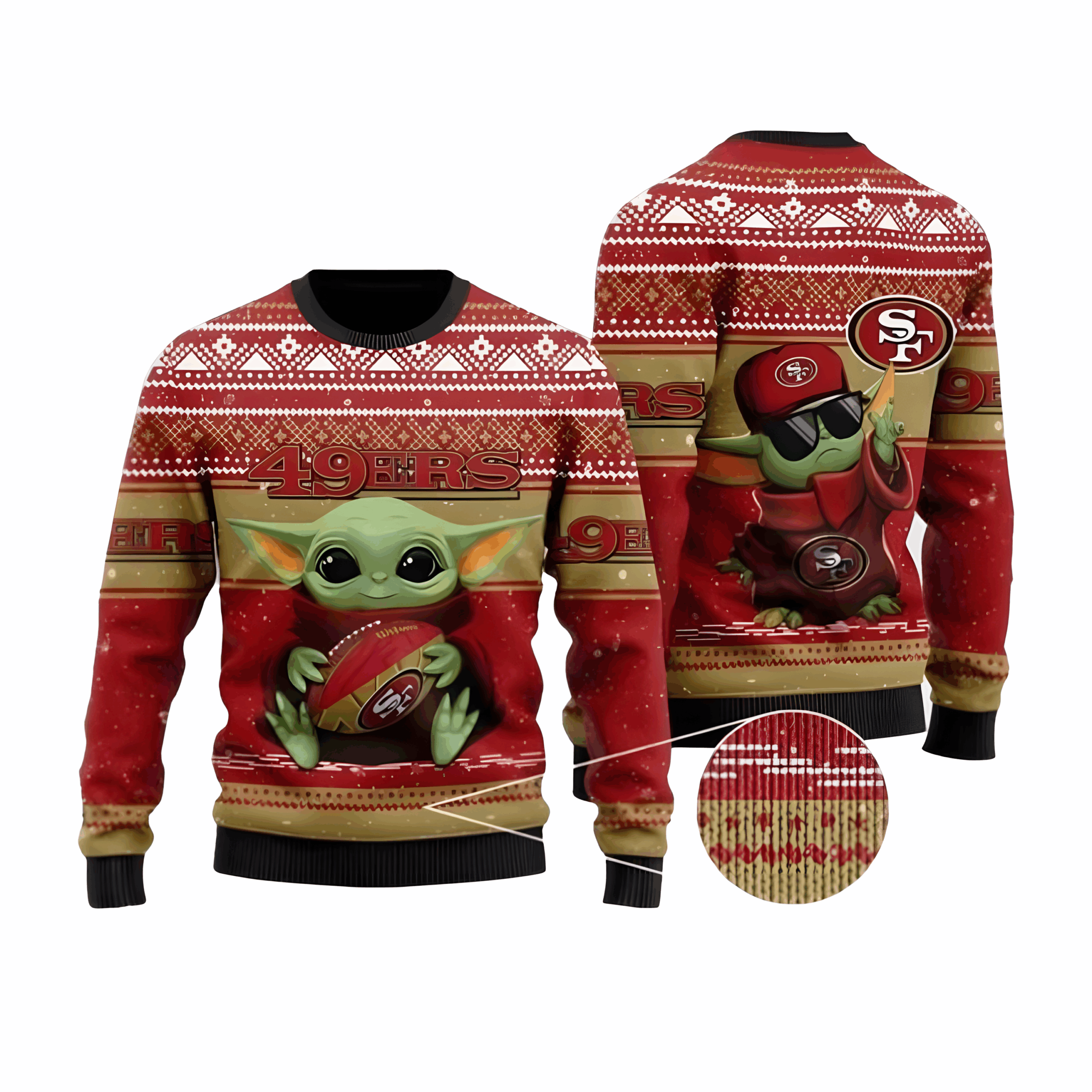 Celebrate the holiday season with a galaxy-class combo of San Francisco 49ers pride and Baby Yoda cuteness in the San Francisco 49ers Christmas Ugly Christmas Sweater Baby Yoda! This sweater blends the festive spirit of Christmas with the undeniable charm of Baby Yoda, all while showing off your love for the 49ers. With the adorable little force-wielder decked out in a 49ers scarf, it’s the perfect way to show your team spirit while getting into the holiday mood.