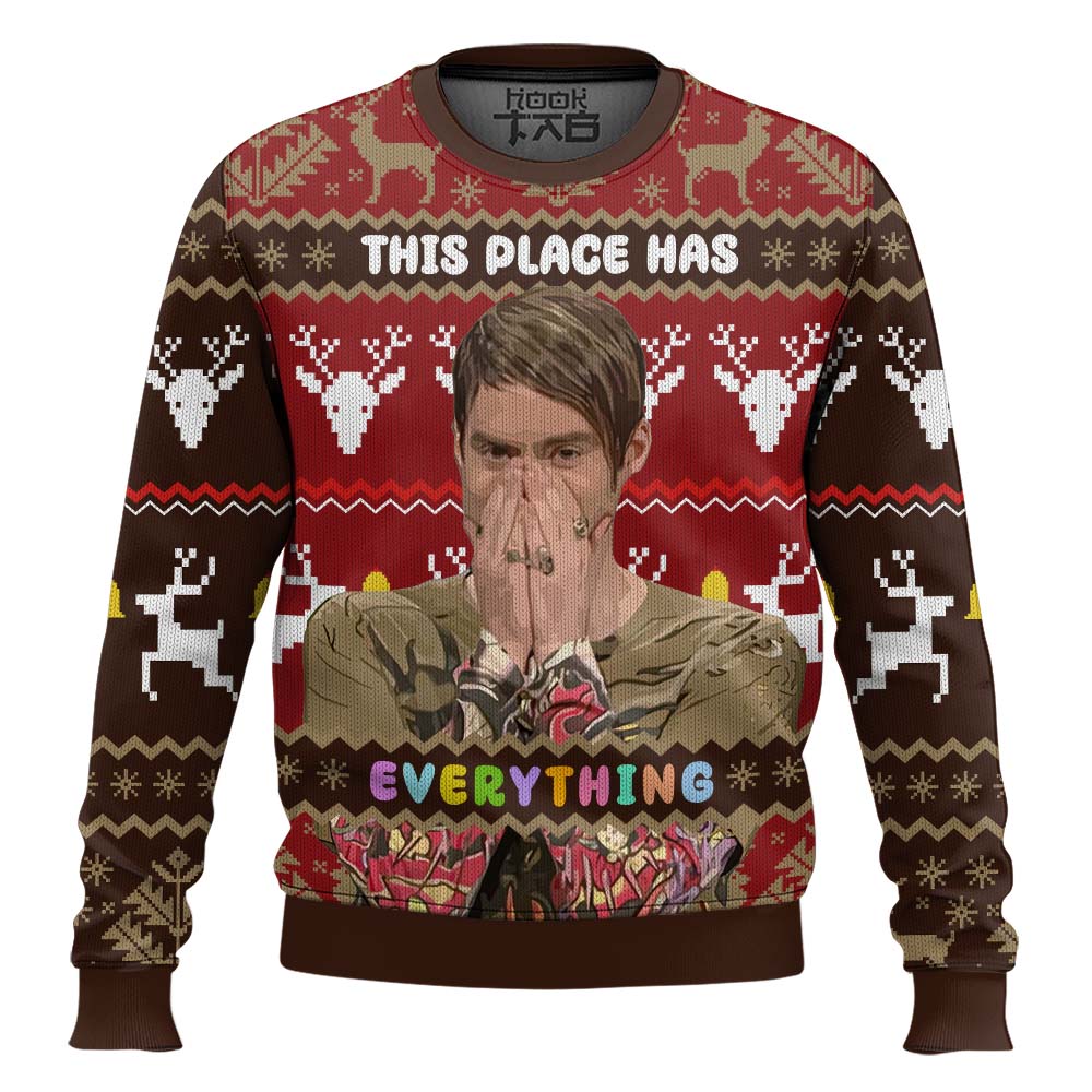 Saturday Night Live Stefon Ugly Sweater This Curvy Glams exclusive Ugly Christmas Sweater design is guaranteed to get attention and get the party started. It?s sure to be your best holiday purchase yet! Material: Our sweaters are made from high-quality polyester wool blend, which keeps you warm and never crack, peel or flake. Features a specialty high definition heat-dye application that ensures long lasting color vibrancy even after machine washing. All our sweaters are handcrafted, cut and sewn one-by-one for the highest quality standard Sizing: Unisex fit. Click on size chart button above add to cart button for addiditional sizing information Care Instructions: Regular handwash; Machine wash (max 40? or 105F); Do not bleach; Iron on a low heat;Tumble dry.