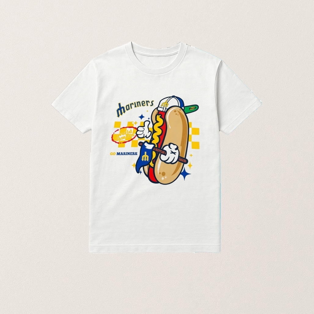Featuring a bold “World Famous Hot Dog” inspired graphic with Seattle Mariners elements, the design blends playful food-themed humor with clean, standout fan style. Perfect for game days, stadium visits, and casual wear, this shirt delivers comfort and classic baseball energy.