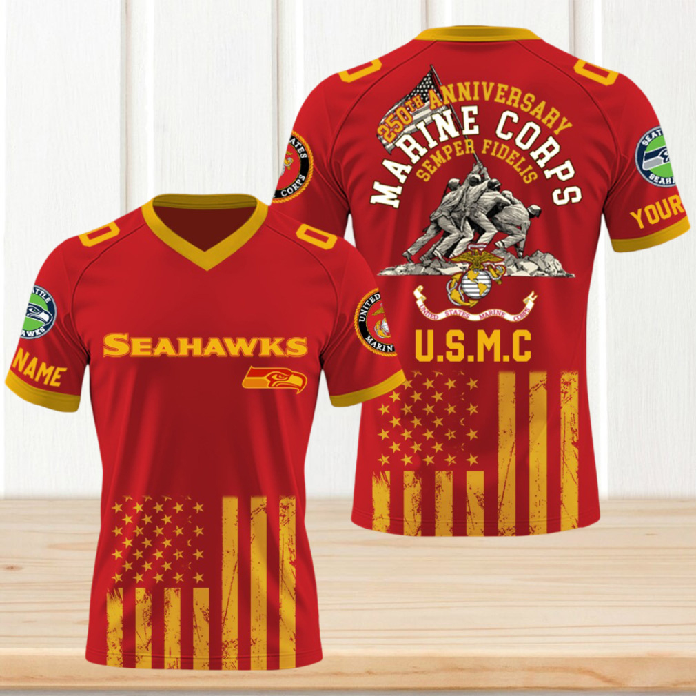 Graphic: High-impact front and back prints combining Seattle Seahawks elements with U.S. Marine Corps 250th Anniversary details