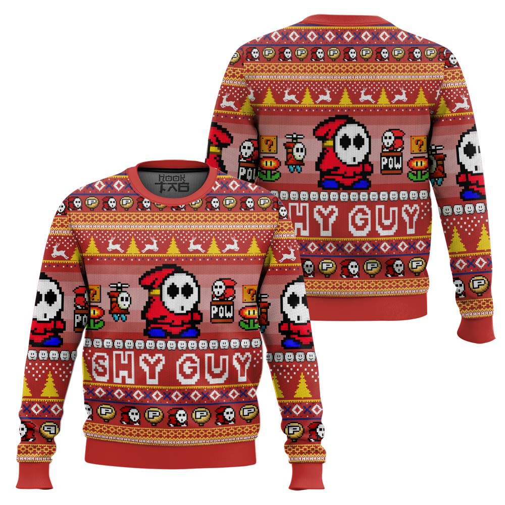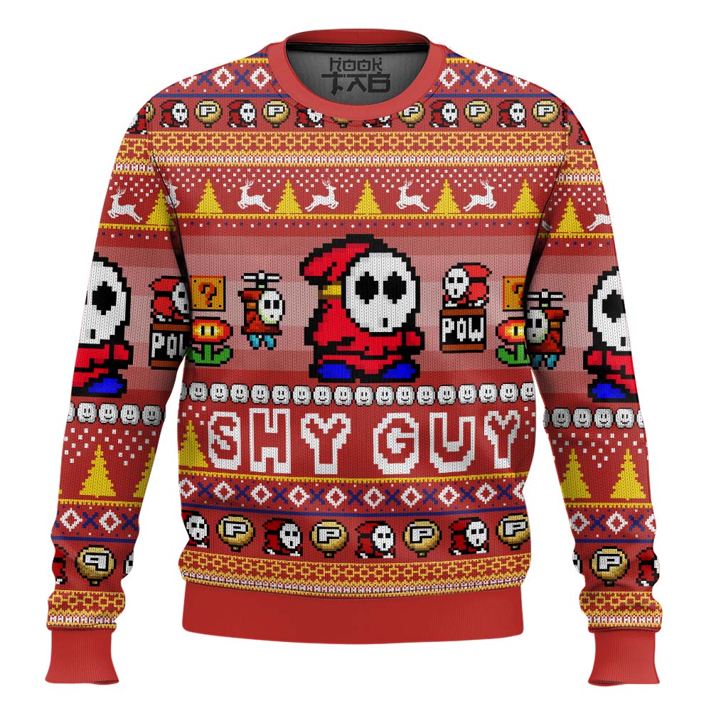 Shy Guy Mario Bros Ugly Christmas Sweater This Curvy Glams exclusive Ugly Christmas Sweater design is guaranteed to get attention and get the party started. It?s sure to be your best holiday purchase yet! Material: Our sweaters are made from high-quality polyester wool blend, which keeps you warm and never crack, peel or flake. Features a specialty high definition heat-dye application that ensures long lasting color vibrancy even after machine washing. All our sweaters are handcrafted, cut and sewn one-by-one for the highest quality standard Sizing: Unisex fit. Click on size chart button above add to cart button for addiditional sizing information Care Instructions: Regular handwash; Machine wash (max 40? or 105F); Do not bleach; Iron on a low heat;Tumble dry.