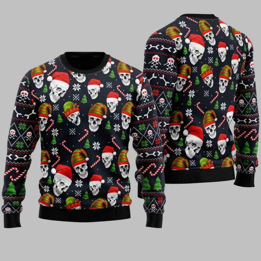 This unique sweater features a bold design of skull faces adorned with Santa hats, interspersed with traditional Christmas elements like snowflakes, candy canes, and Christmas trees. The contrasting imagery creates a striking visual that is both festive and edgy.