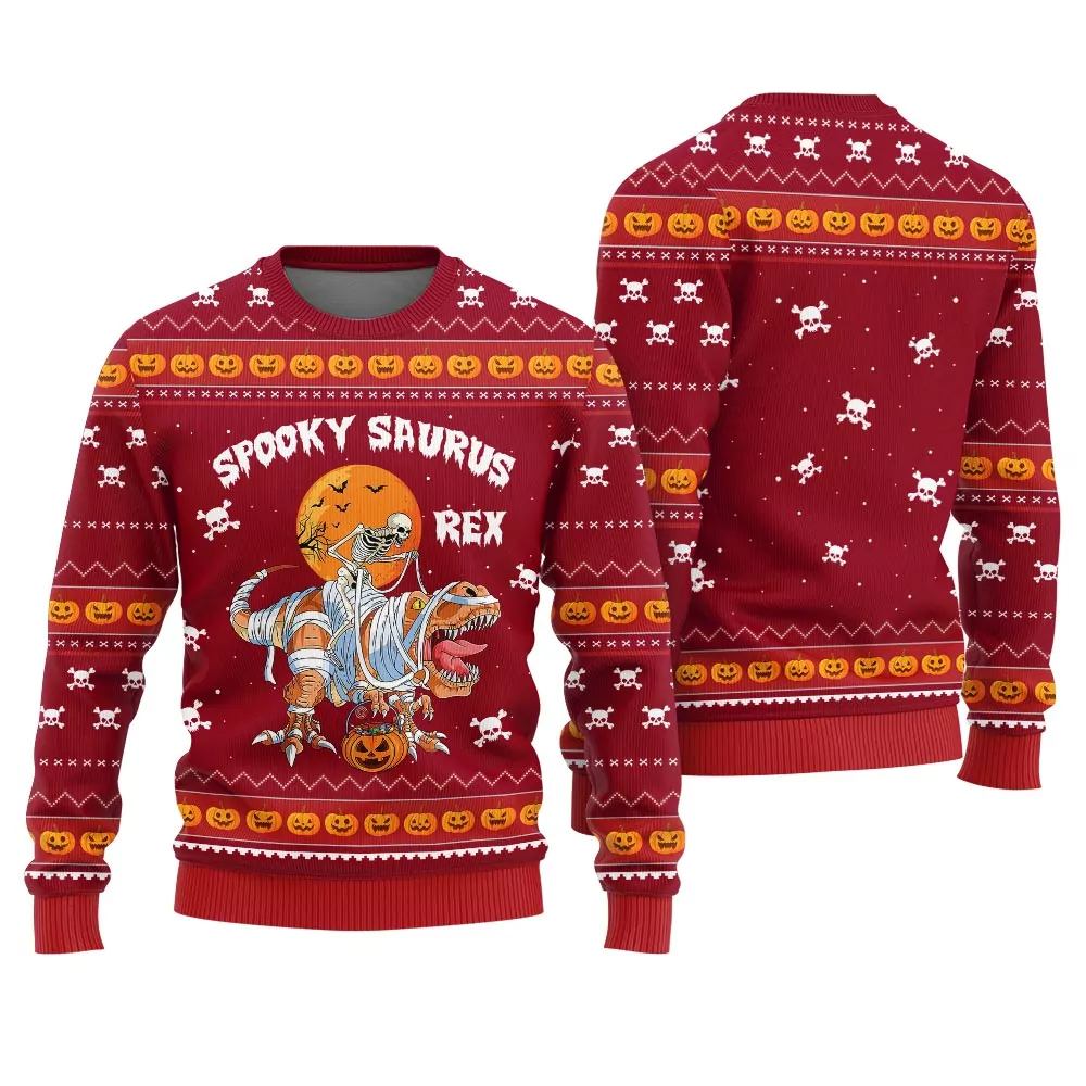 This sweater features a fun, playful design that combines the terror of a T. rex with the spookiness of Halloween — a true Spooky Saurus Rex. With its bright colors, bold graphics, and dinosaur-inspired flair, it’s the perfect way to showcase your love for both Halloween and the world of dinosaurs. Who says spooky can’t be a little roarsome?