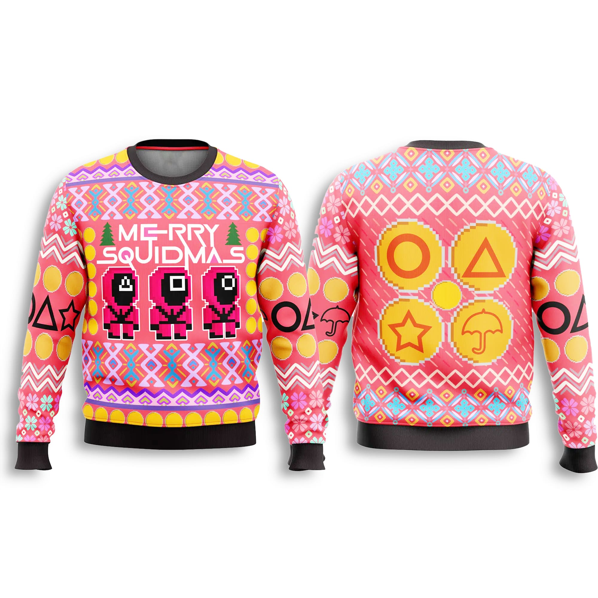 This sweater merges the intensity of Squid Game with the fun of the holidays. Featuring the playful yet ominous “Merry Squidmas” slogan and unique design elements from the iconic show, it’s a fun way to bring some suspense and intrigue to your Christmas festivities. It’s not just an ugly Christmas sweater — it’s a tribute to the mind-bending challenges of Squid Game, with a festive spin.