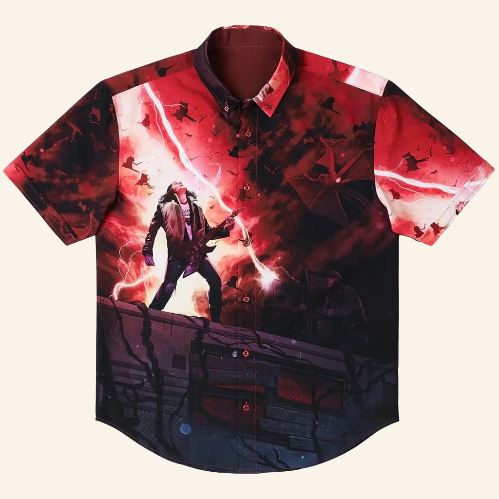 Make a bold statement with the Stranger Things Eddie Munson Merch Stranger Things x RSVLTS Most Metal Ever Button Up Shirt – WearandDecor. Designed to stand out, this shirt blends expressive graphics with a relaxed tropical vibe, perfect for casual days, vacations, or themed events.