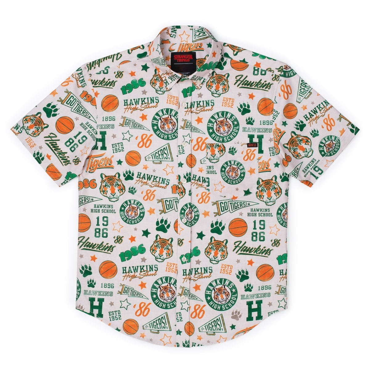This shirt features a high-quality printed “Go Tigers!” design, paired with tropical hibiscus flowers and palm leaves. It’s the perfect way to combine Hawkins High pride with the fun, carefree energy of a Hawaiian shirt.