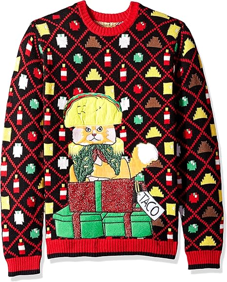 Graphic: High-quality knit showcasing a festive taco-cat mashup with bright holiday details