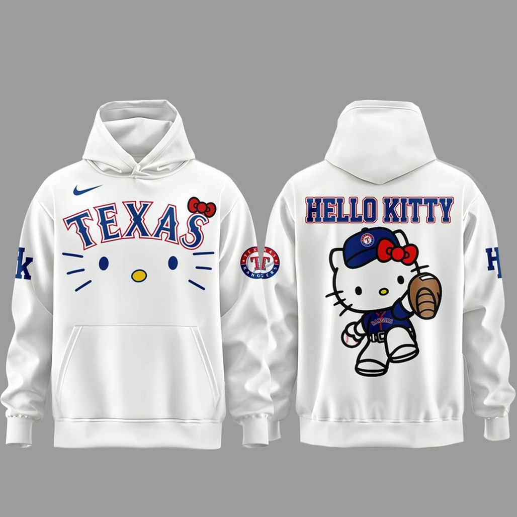 A delightful fusion of Texas Rangers identity and Hello Kitty’s iconic kawaii style.
