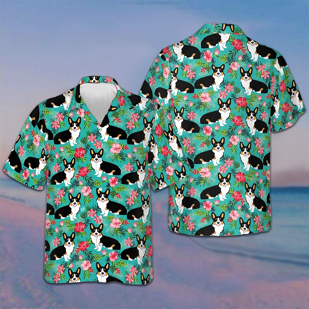 Tropical Floral Corgi Hawaiian Shirt Dog Owner Beach Button Down Shirt Men Gift