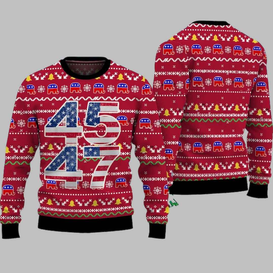 The Trump 45 47 Ugly Christmas Sweater features a vibrant and patriotic design, complete with the numbers ?45? and ?47? in bold, distressed-style American flag print, representing the past and future of Trump?s presidency. The red background is decorated with traditional holiday elements, such as snowflakes, Christmas trees, and, of course, Republican elephants, adding a playful holiday twist to the sweater. Crafted from soft and cozy knit fabric, this sweater provides warmth and comfort, making it perfect for winter festivities and gatherings. With its bright colors and eye-catching graphics, this sweater is a festive way to showcase your support and make a statement during the holiday season.