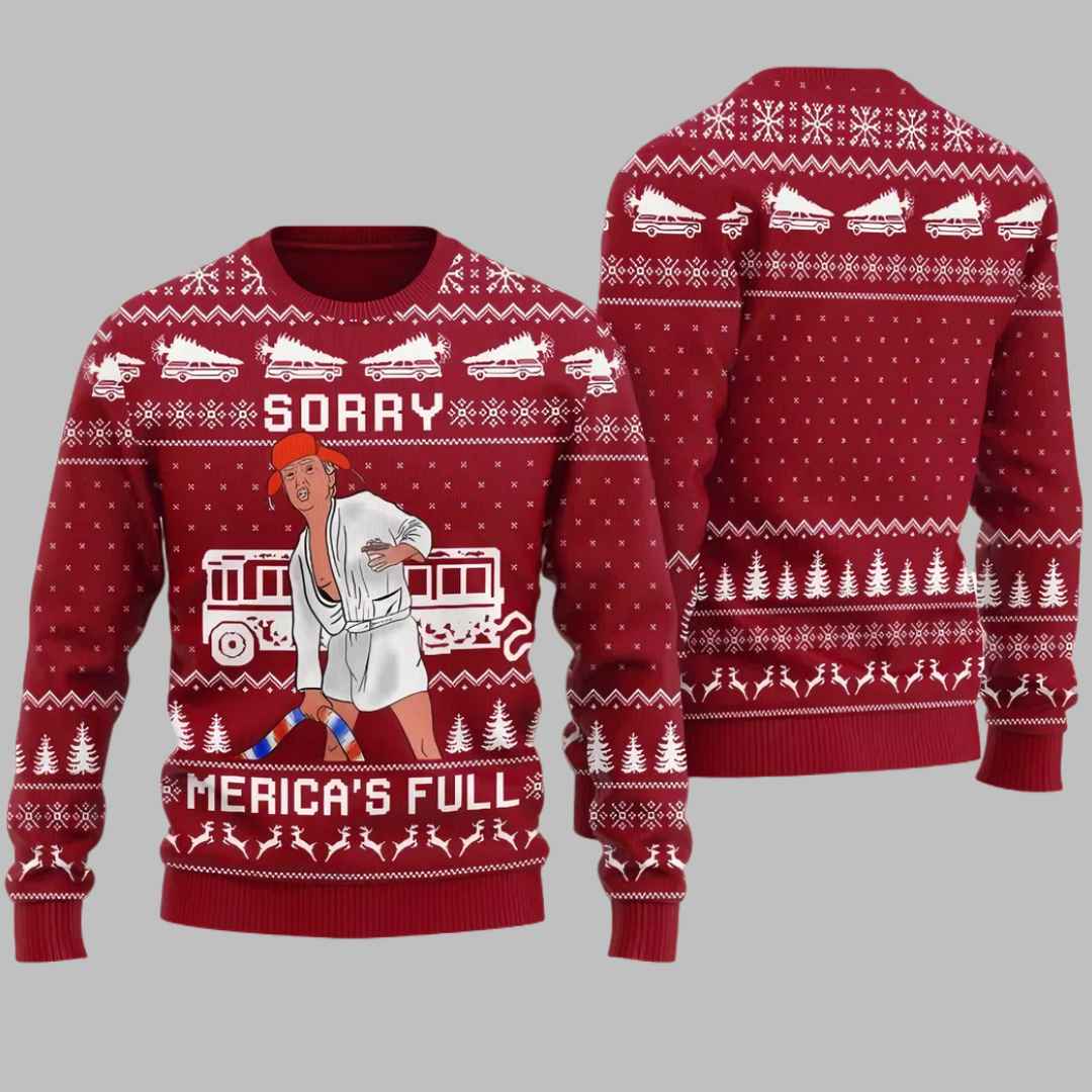 The Trump Cousin Eddie Ugly Christmas Sweater brings a playful twist to holiday wear, combining the memorable image of Trump styled as Cousin Eddie in a classic bathrobe, complete with the ?Sorry, ?Merica?s Full? slogan. The rich red background is adorned with traditional Christmas sweater elements?snowflakes, Christmas trees, reindeer, and even RVs reminiscent of the famous Cousin Eddie scene. Crafted from a soft and cozy fabric, this sweater is perfect for chilly winter nights while adding a unique edge to your holiday attire. With ribbed cuffs, neckline, and hem, the sweater offers a comfortable and snug fit, making it easy to wear all evening long.