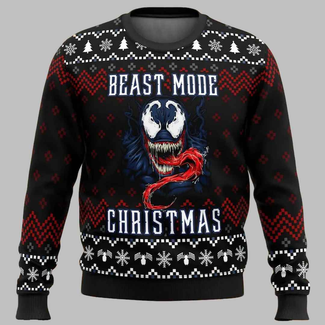 The Venom Beast Mode Christmas Ugly Christmas Sweater features a ferocious image of Venom in full “beast mode,” complete with bared fangs and a menacing grin. The bold “Beast Mode Christmas” message and festive snowflake patterns add a touch of holiday spirit to this otherwise intimidating design.