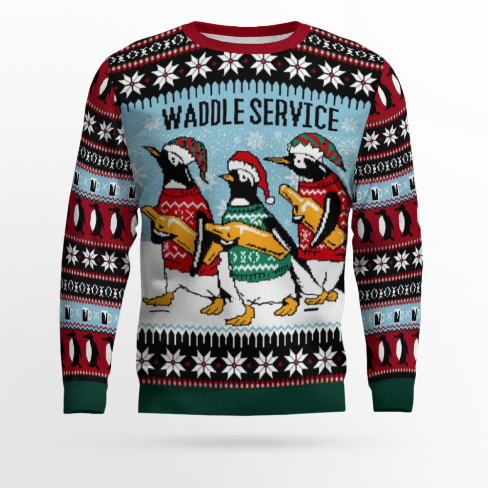 Spread holiday cheer with the Waddle Service Penguin Ugly Christmas Sweater! This festive sweater features a crewneck and a fun, colorful design of penguins waddling in a single-file line.