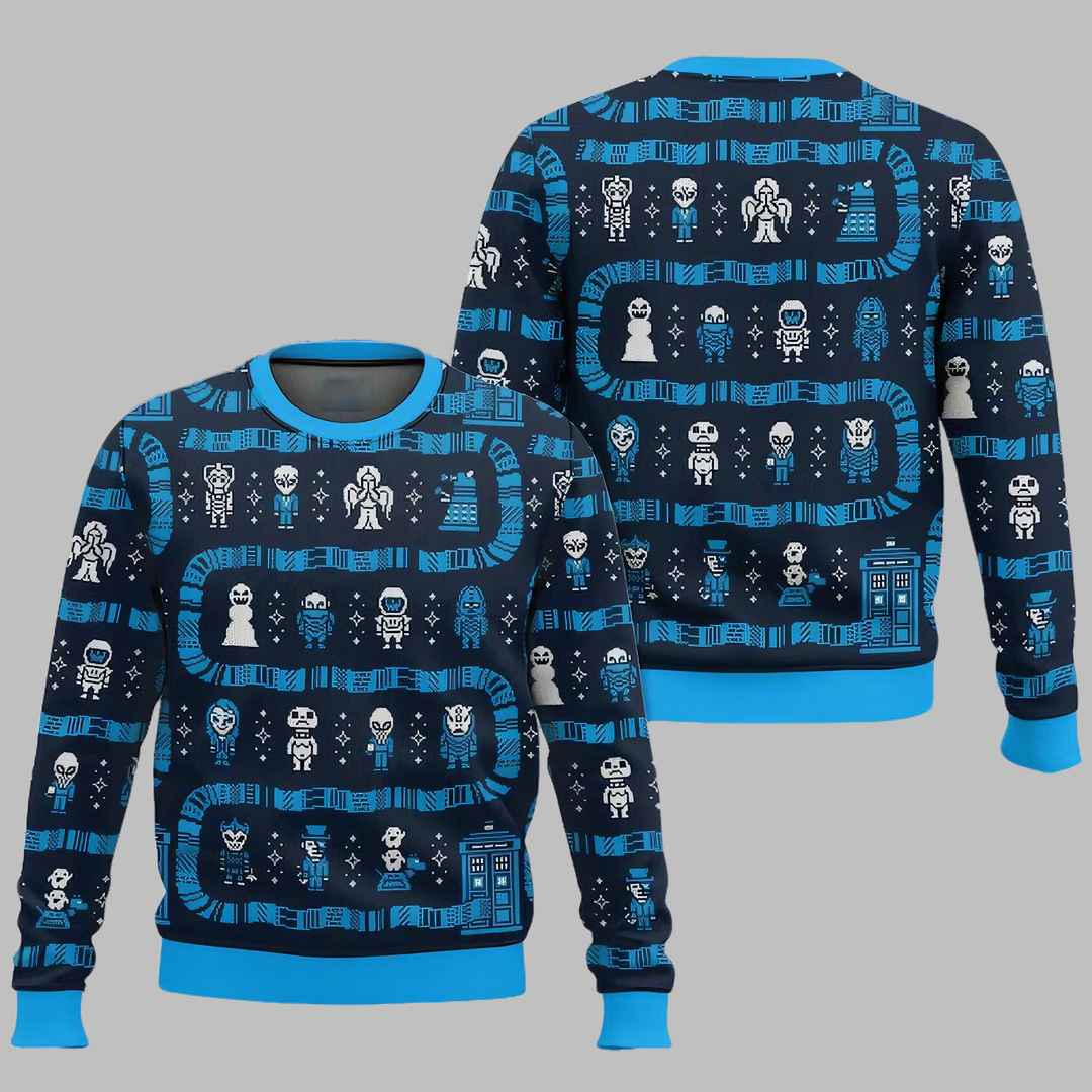 This eye-catching Christmas sweater is a Whovian’s dream come true. It showcases a pixelated design featuring a multitude of iconic Doctor Who characters, including various Doctors, companions, and even Daleks and Cybermen, all arranged in a festive pattern. The contrasting blue and white design adds a vibrant touch.