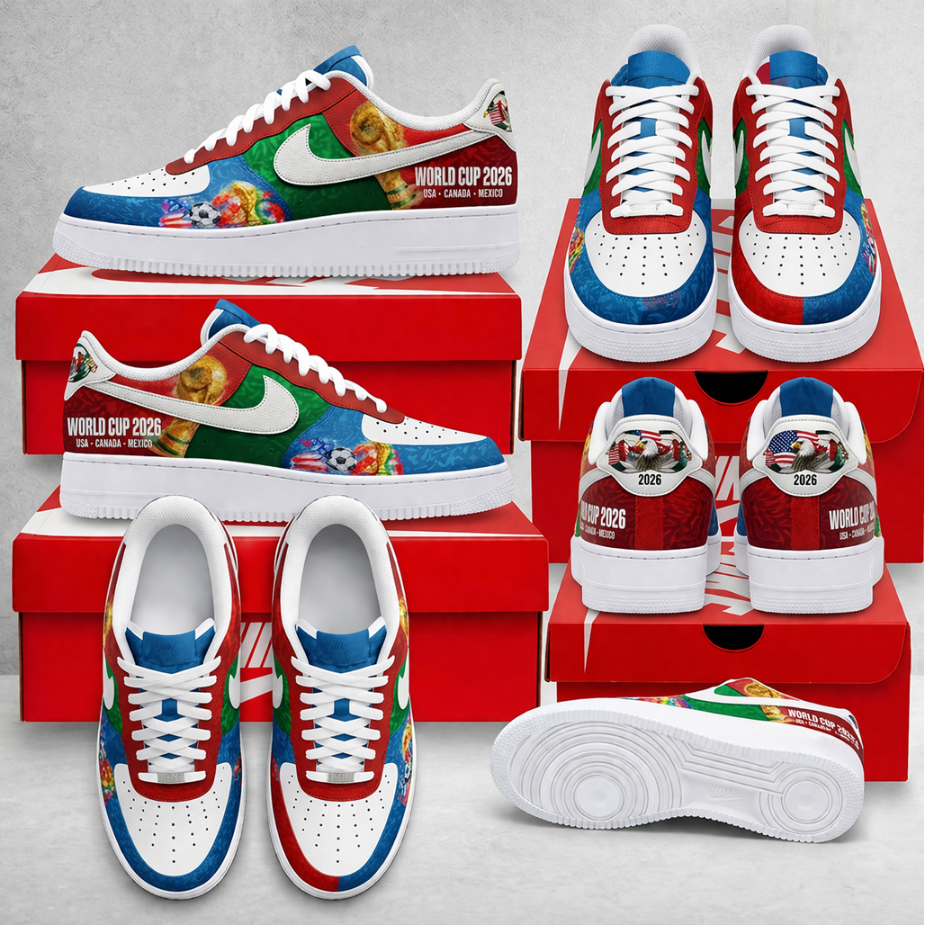 The World Cup 2026 USA Canada Mexico Air Force 1 Shoes Sneakers are a must-have for football fans celebrating one of the biggest global sporting events. Inspired by the 2026 FIFA World Cup hosted across the USA, Canada, and Mexico, these sneakers feature vibrant graphics that capture the unity, energy, and excitement of the tournament.